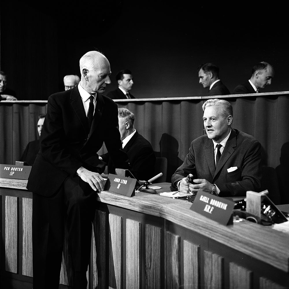 Valgdebattene i fjernsynet var blitt en viktig arena for politikerne. Her er Høyres John Lyng og statsminister Gerhardsen i forberedelser til partilederdebatten ved stortingsvalget i 1965.