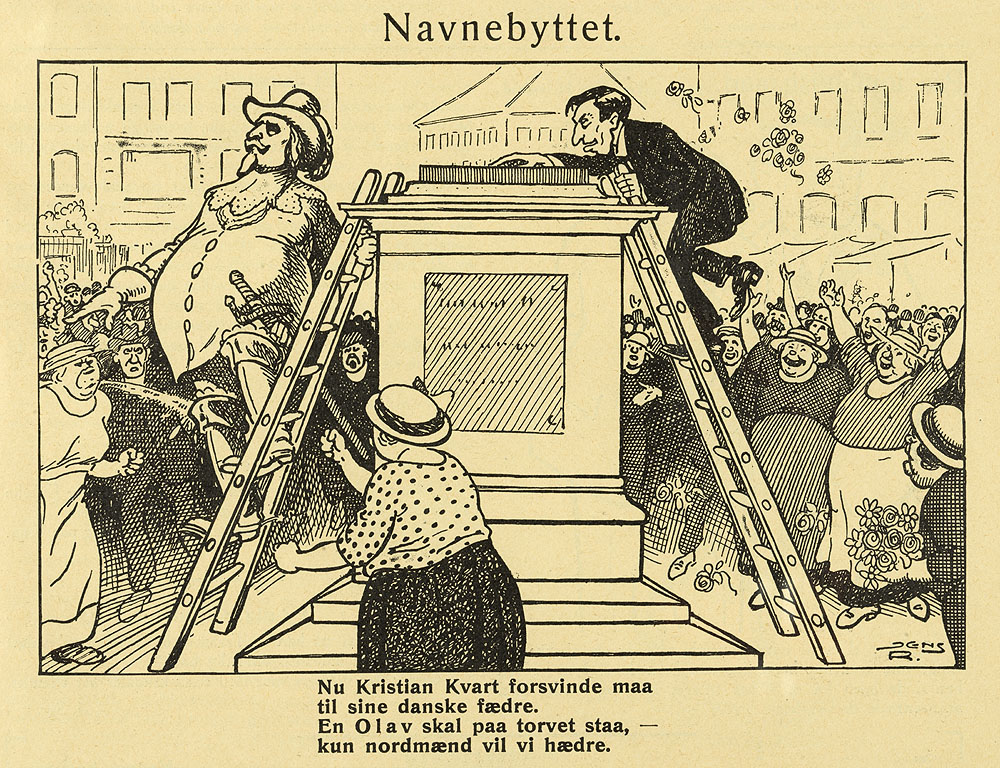 Billedstormere i aksjon på Stortorget i 1924. Da det ble besluttet at Kristiania skulle skiftet navn til Oslo, foreslo Hvepsen å erstatte statuen av kong Kristian 4 med kommunistpartiets Olav Scheflo, og skriver: Nu Kristian Kvart forsvinde maa til sine danske fædre. En Olav skal paa torget staa, kun nordmænd vil vi hædre. Tegning av Jens R. Nilssen 1924.
