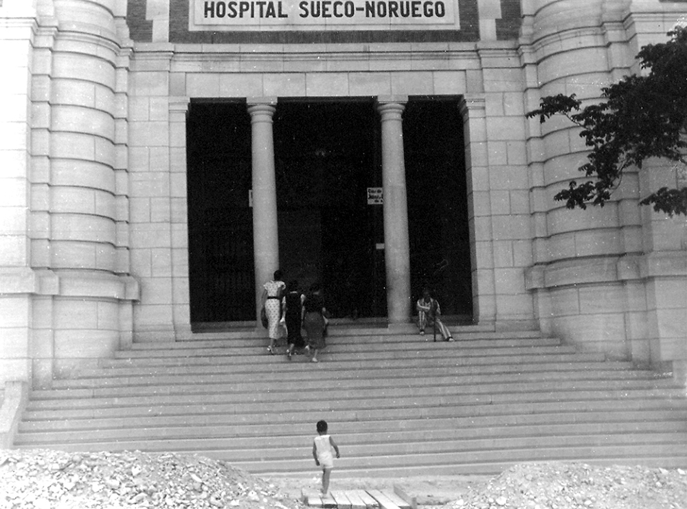 Spanske pasienter slapper av i solskinnet på trappa utenfor sykehuset.Foto: Ukjent / Arbark