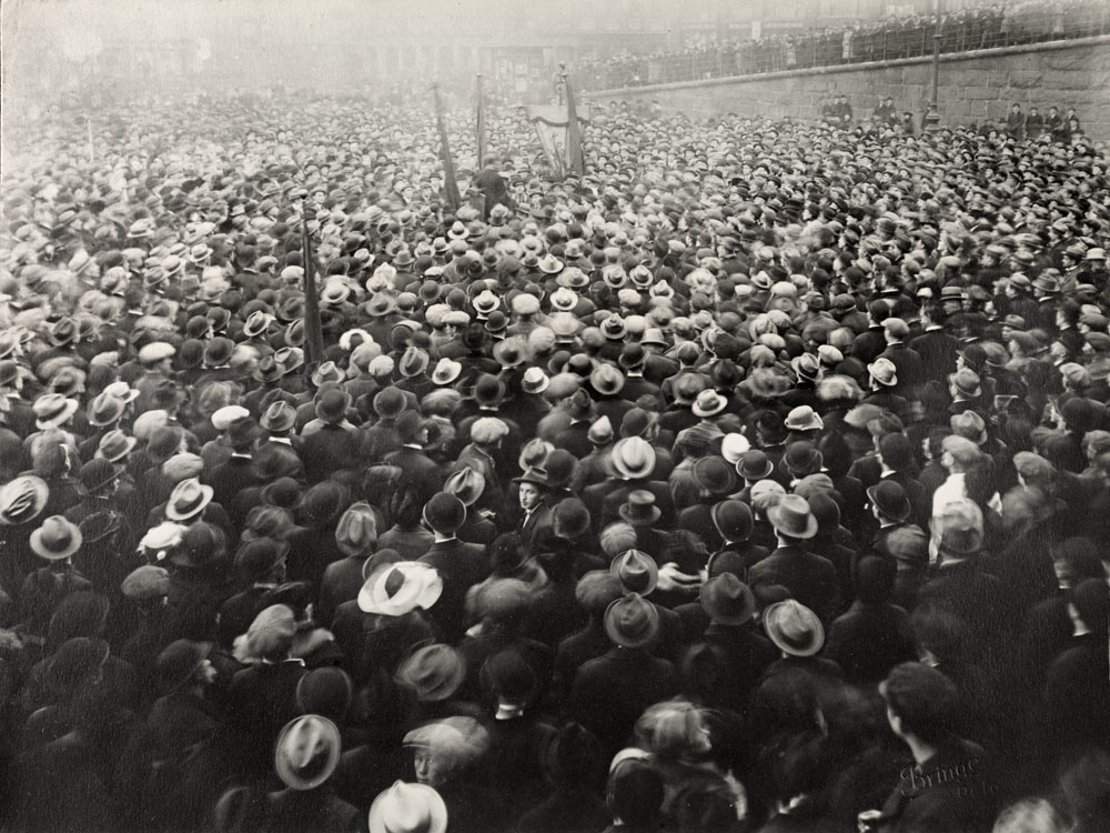 Martin Tranmæl taler under massemøte på Youngstorget under den store demonstrasjonen i forbindelse med jernbanestreiken, 4. desember 1920.